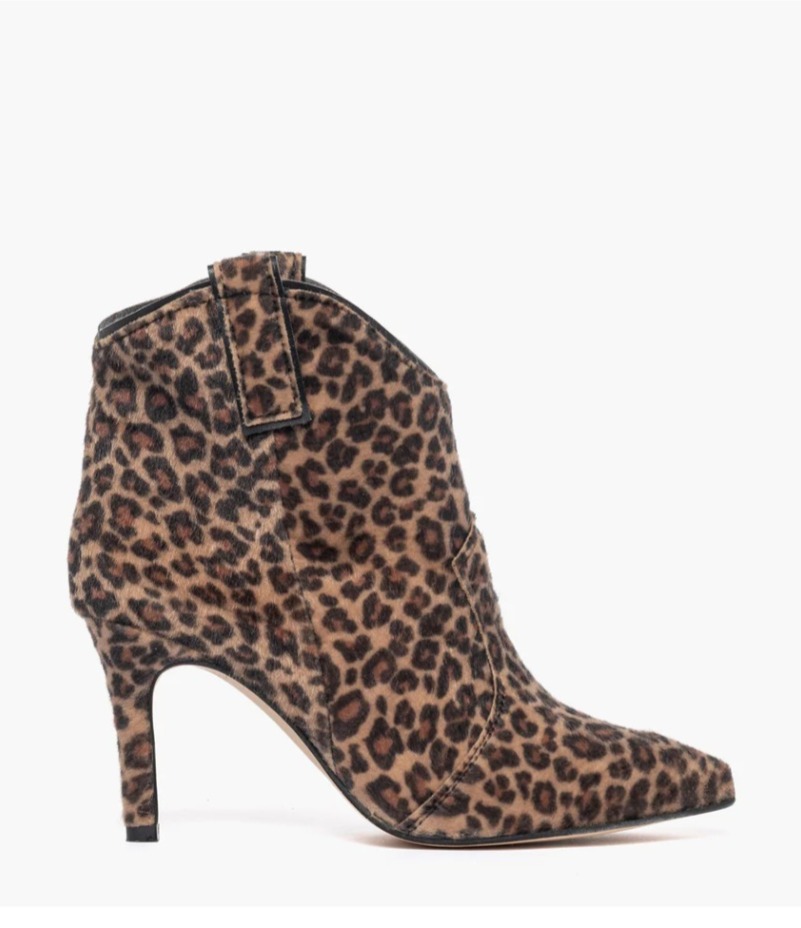 Ankle boots in animalier leather with zip, leather interior and insole, leather-covered heel, height 8 cm. Regular fit, slightly narrow toe forward. Footwear made in an artisanal way, strictly Made in Italy.