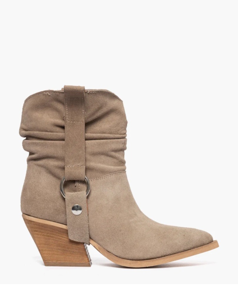 Ankle boots in taupe suede, wrinkled and with silver applications, leather interior, without zip, true to size fit, narrow toe, tecsana shape, brushed neutral sole, height 7. Handcrafted footwear, made in Italy.