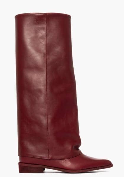 Burgundy leather knee-high boot, no zip, leather interior, covered heel, 8.5cm. Handcrafted footwear, Made in Italy.