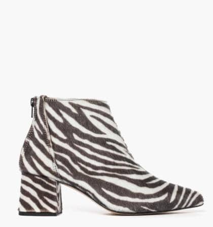 Ankle boots in zebra-striped synthetic pony skin with purple suede trim, covered heel 5.