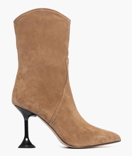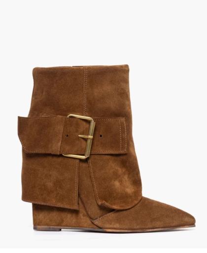 Ankle boots in chocolate suede, above the ankle, with strap and buckle, covered heel, height 11. Right fit, narrow toe, leather lining.