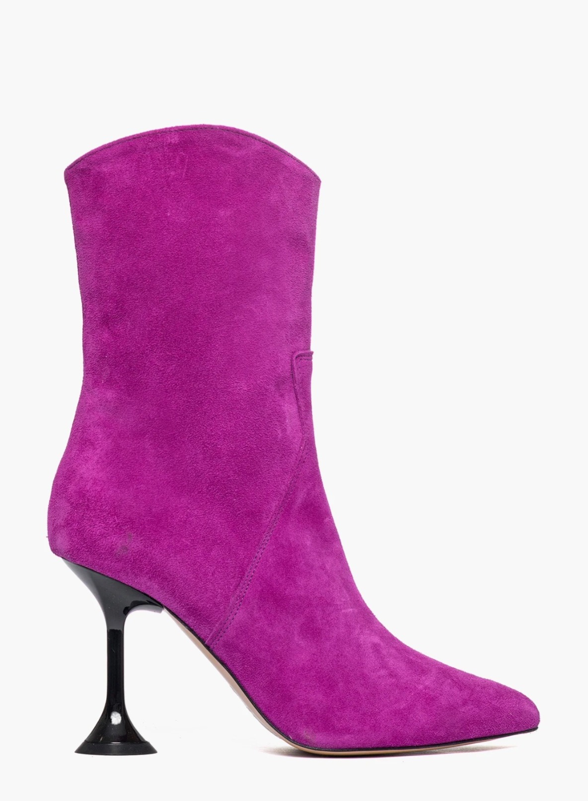 Magenta suede ankle boots with a zipper, a snug fit, a glossy lacquered heel, a 9/10 height, leather lining, a narrow toe, and a regular fit. Handcrafted footwear, made in Italy.