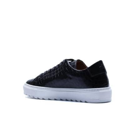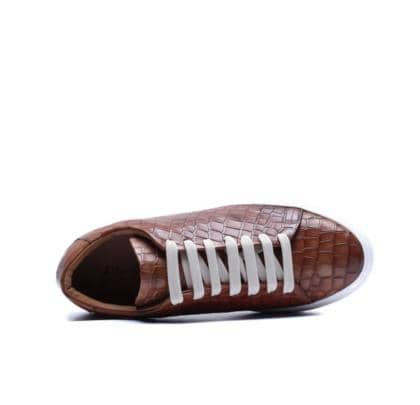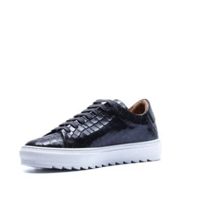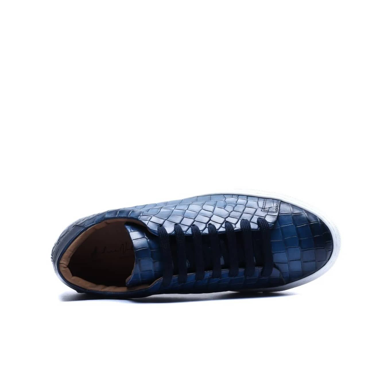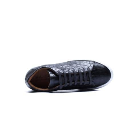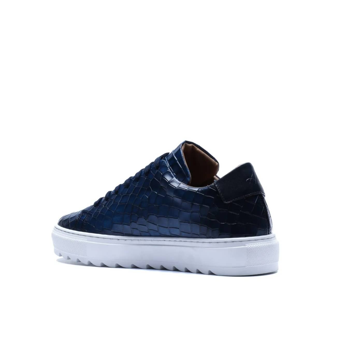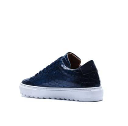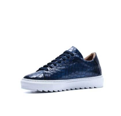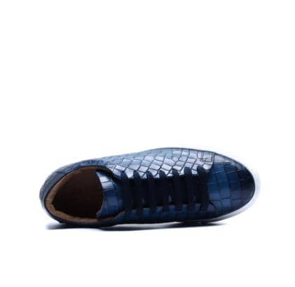 Made in Italy sneaker crafted from genuine hand-dyed blue leather with natural shades, embellished with a shiny crocodile-print leather upper that elegantly reflects the light, without sacrificing an urban edge.