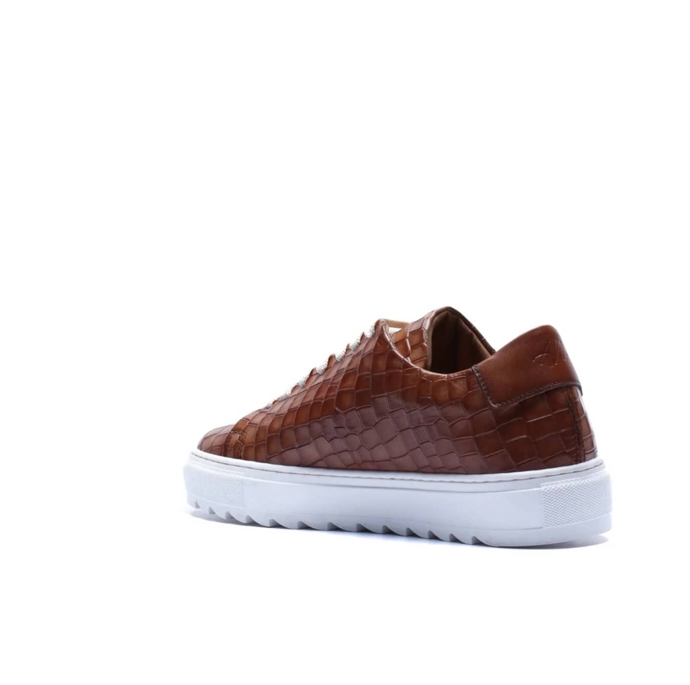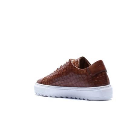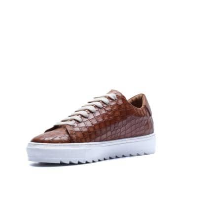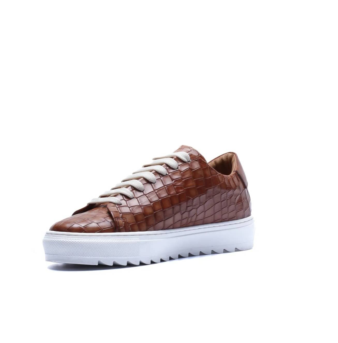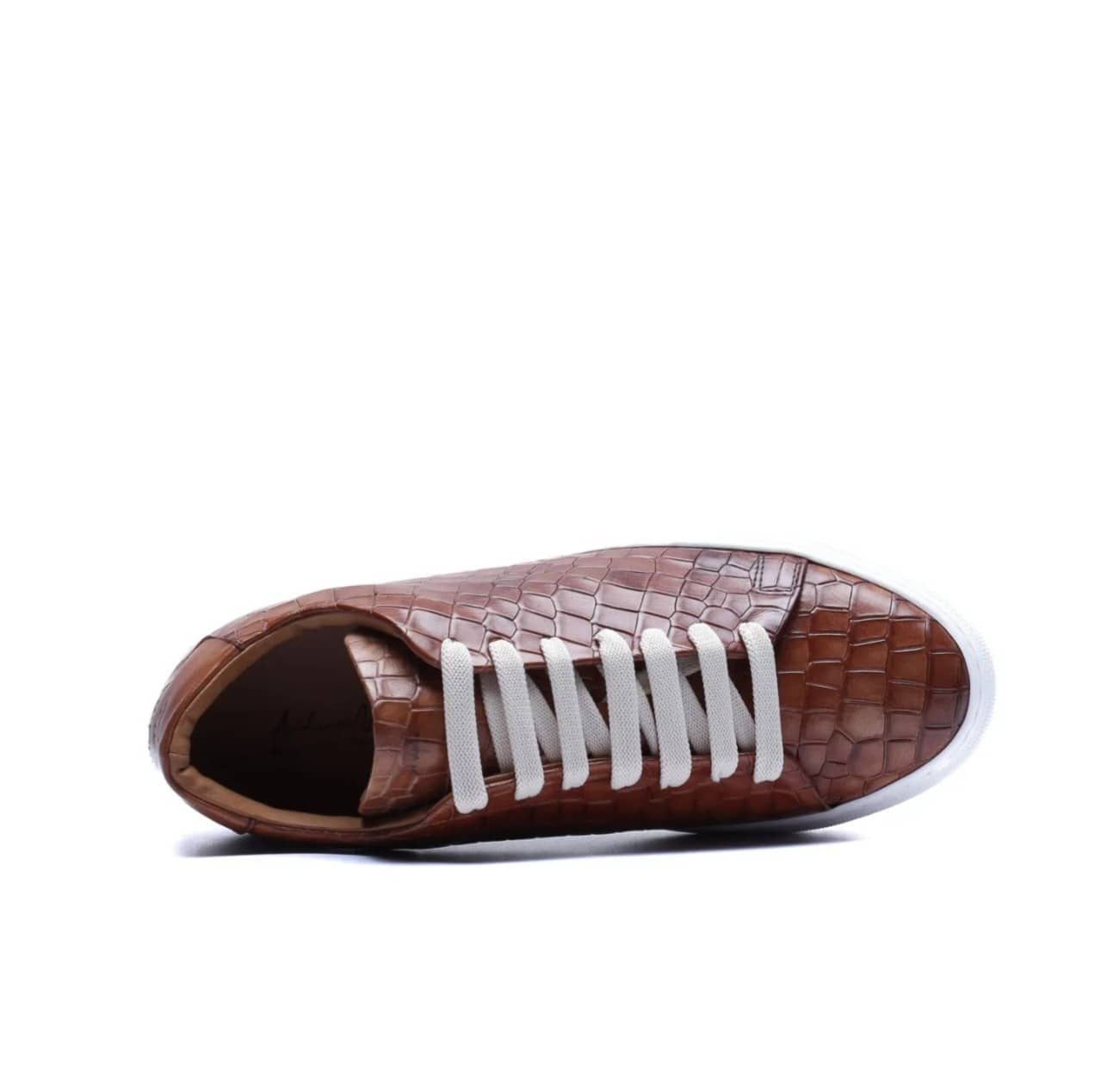 Made in Italy sneaker crafted from genuine hand-dyed blue leather with natural shades, embellished with a shiny crocodile-print leather upper that elegantly reflects the light, without sacrificing an urban edge.