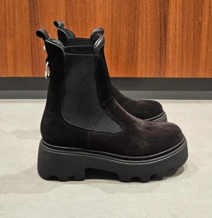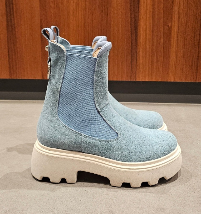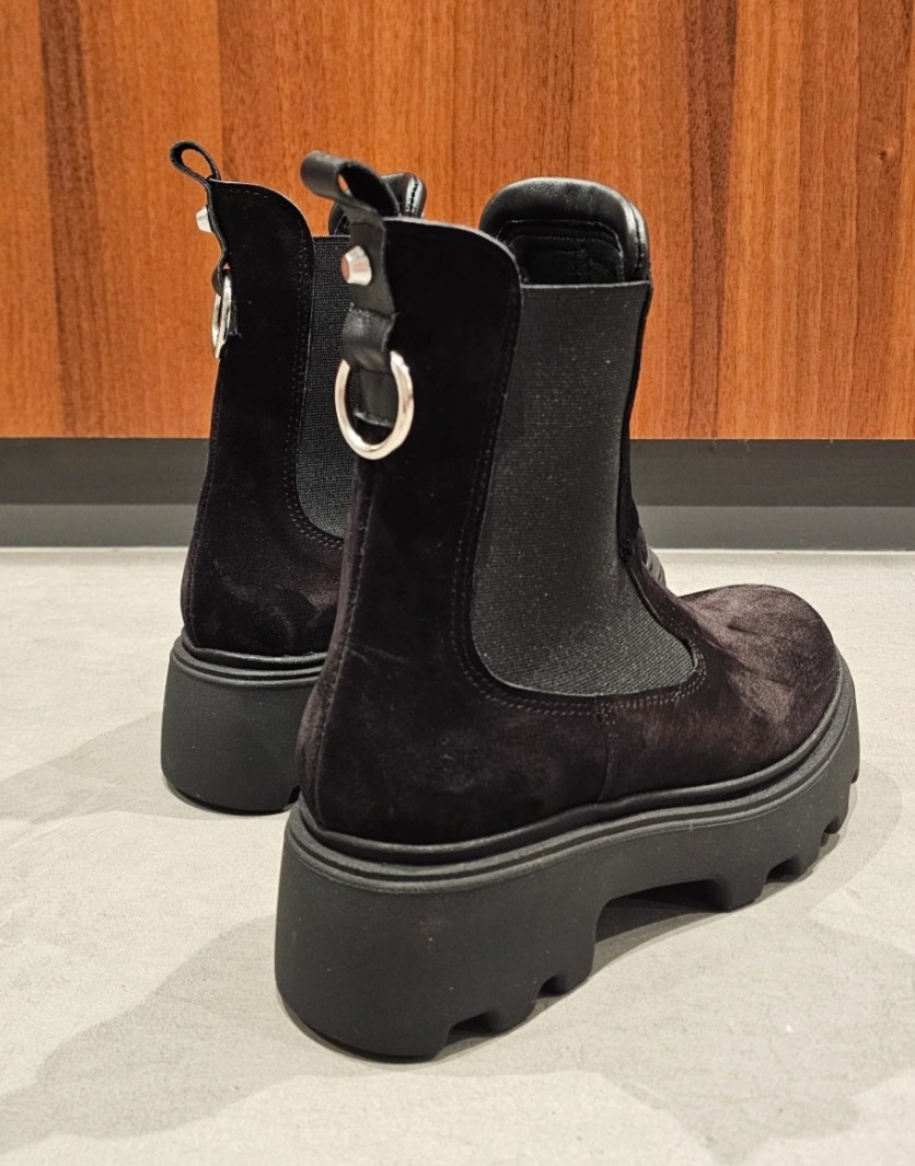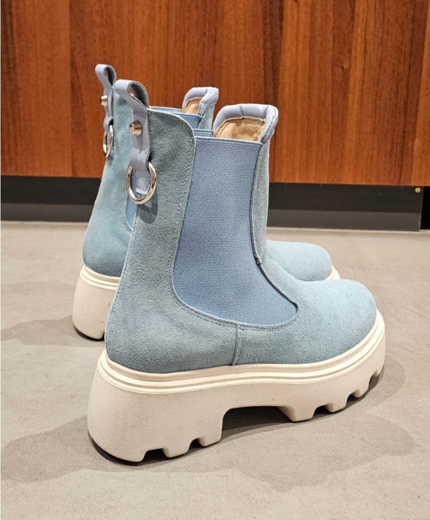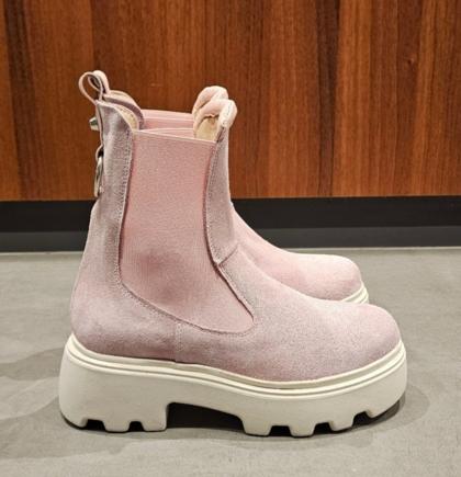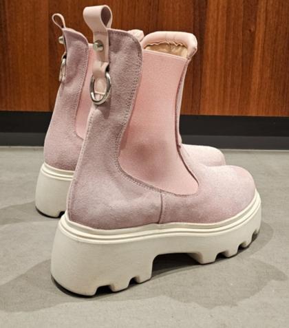 Pink suede ankle boots with matching elastic sides, a silver accessory on the back, leather lining, lightweight rubber sole, height 5, regular fit, round toe. Handcrafted footwear, made in Italy.